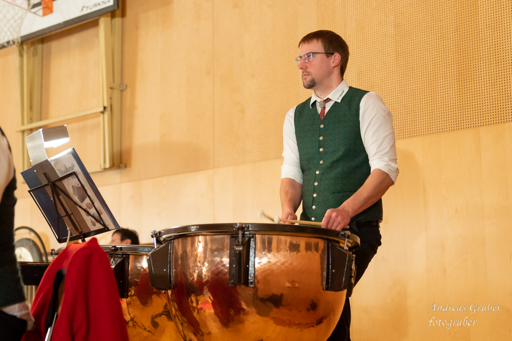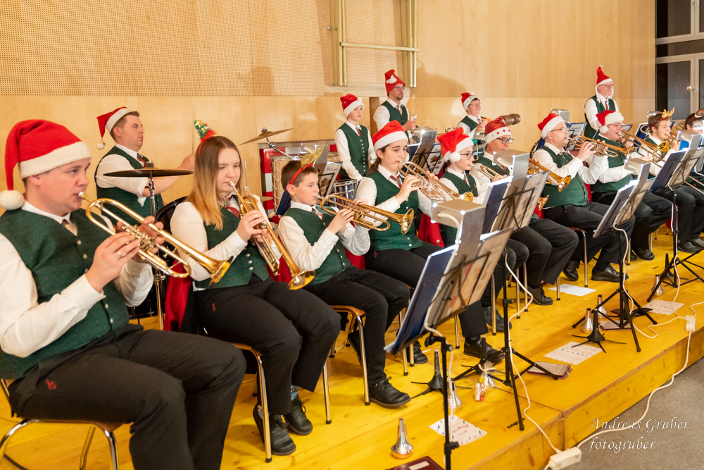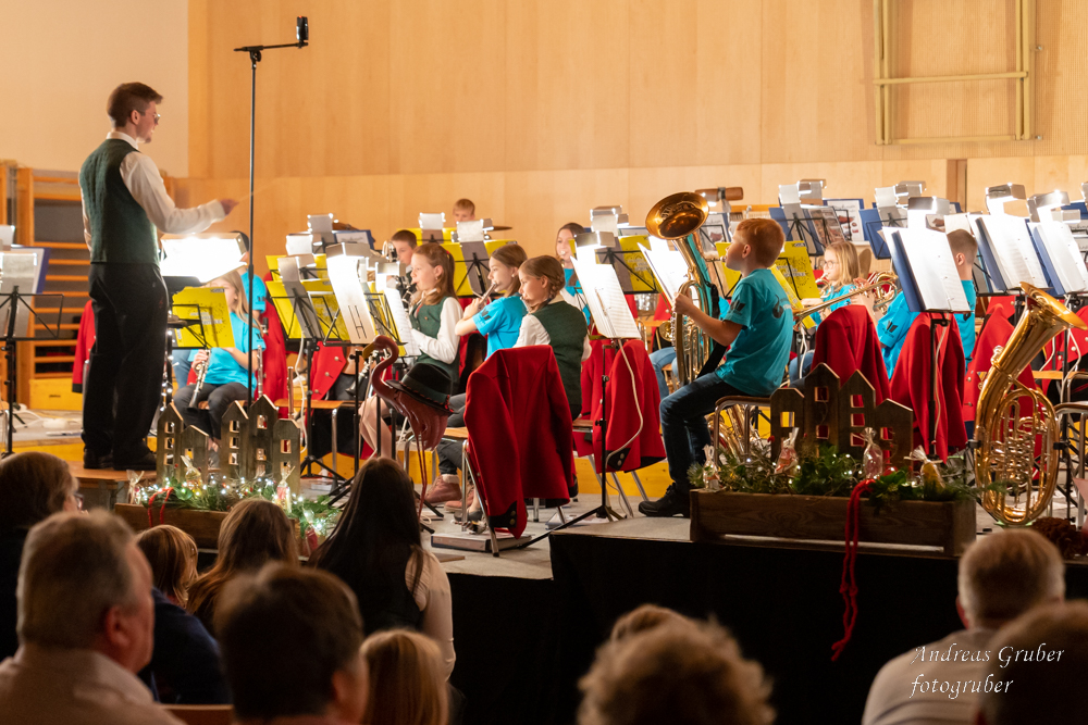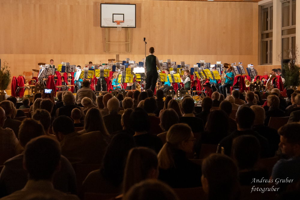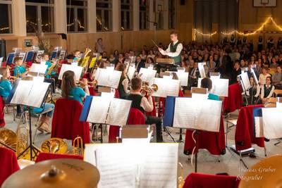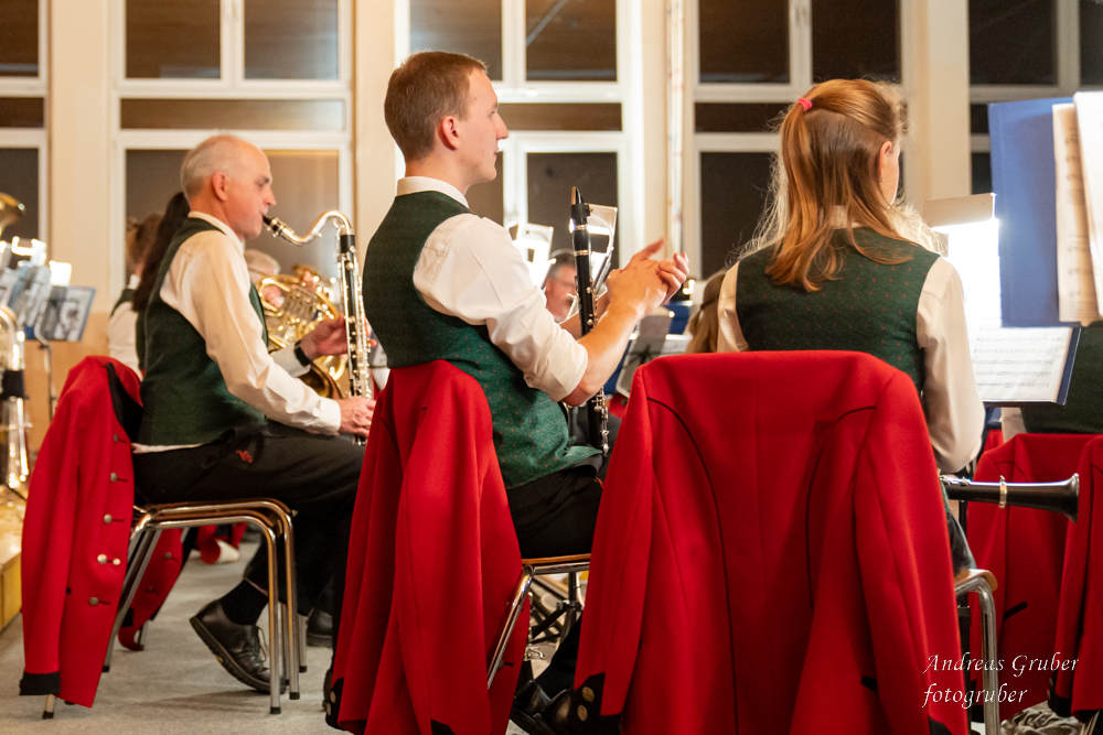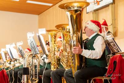 Mit "Carmina Burana" einem überaus imposanten Werk von Karl Orff starteten wir zu unserem traditionellem Termin ins Weihnachtskonzert. Geleitet von David und Ina boten wir herrliche Kompositionen aus vielen Bereichen der Musik. Unsere beiden Wertungsstücke "Monumentum" und "Enjoy the Music", mit denen wir bei der heurigen Konzertwertung einen großartigen Erfolg einspielten, gehörten natürlich dazu. Ina führte uns über den Atlantik zuerst nach Nordamerika mit "Der mit dem Wolf tanzt" in die unendlichen Weiten der Prärie. Mit "Gabriel´ s Oboe", von Ina für Klarinette arrangiert, ging unsere Reise solistisch nach Südamerika. Unser Posaunenquartett holte das Publikum aus der Pause zurück zum begeisternden Auftritt unseres Jugendorchesters. Der "Kaiserin Sissi Marsch" eröffnete den zweiten Teil unseres Konzertabends. Mit der überaus flotten "Fanynka Polka" besuchten wir unsere böhmisch-mährischen Nachbarn. Danach flanierten wir genüsslich mit "Les Champs Elysees" über die Pariser Prachtstraße. Mit dem aktuellen Hit "Merry Christmas" gesungen von unseren Flötistinnen Tina und Carina und arrangiert von Kapellmeister David beendeten wir unser Konzert. Als Zugabe hatten wir "Best of Mark Forster", ebenfalls von David für uns arrangiert, vorbereitet. Mit einem kräftigen "Prosit Neujahr" und dem "Radetzky Marsch" war es dann leider schon vorbei. Ein herzliches Dankeschön an alle, die uns fürs Gelingen unseres Konzertes unterstützt haben. Ein riesiges Danke an unser Publikum für euer Kommen und euren großartigen Applaus!