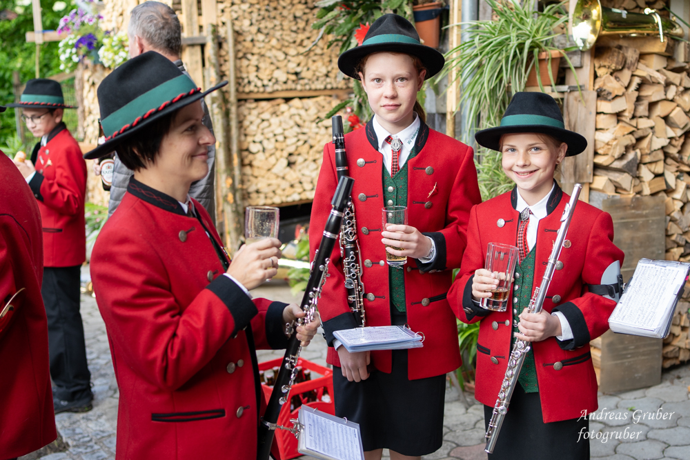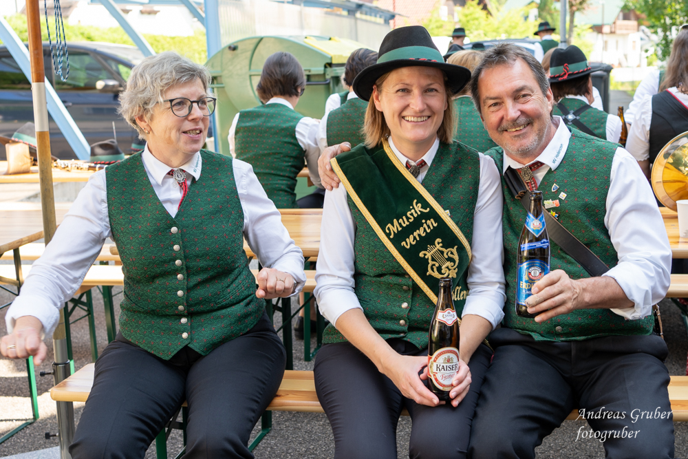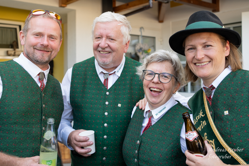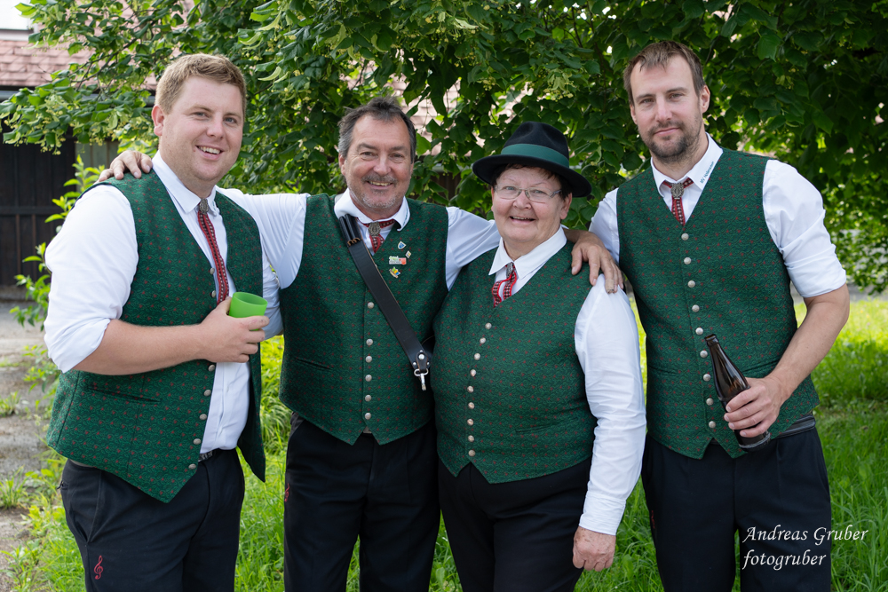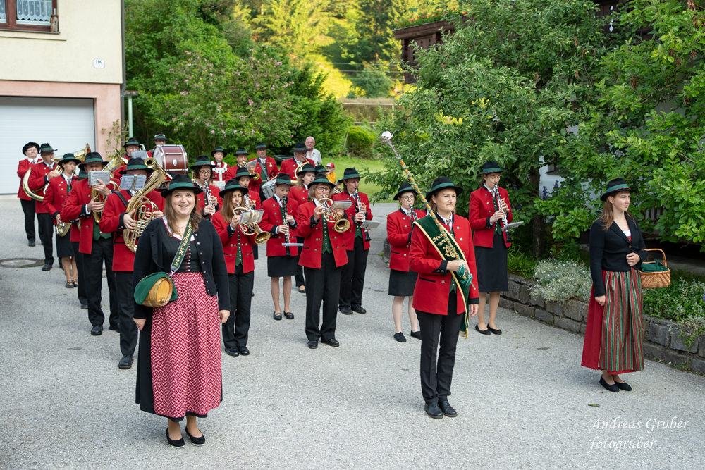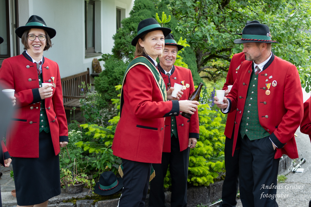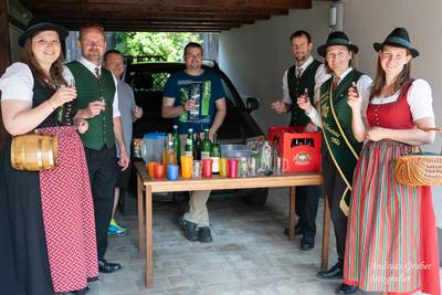 Mit flotter Marschmusik weckten wir das Dorf auf. Am frühen Morgen freuten wir uns über die Einladung zum Frühstück. Franz Irninger und sein Team verwöhnten uns im Gasthaus Dornleiten – Dorfstube mit einem kräftigen Frühstück. Gut gestärkt gings anschließend auf den kilometerlangen Weg durch die Gemeinde. Unser Ziel war die Einladung zum Mittagessen bei Franziska und Andreas Kronsteiner. Zwischendurch gab es zahlreiche Halts mit willkommenen Erfrischungen. Wir bedanken uns bei Familie Hubert Mandl und Josef Schnabler für die erste Rast. Eine kurze Pause gönnten wir uns bei Maria Anna Jagersberger und Ernst Fohringer. Bgm. Manuela Zebenholzer freute sich mit ihrer Familie über unseren morgendlichen musikalischen Besuch. Bei unserer Klarinettistin Barbara gabs eine Einladung auf Getränke. Ein großer Dank von uns Musikanten gilt Martina und Max Geyerlechner. Hier gab es neben den kühlen Erfrischungen auch eine kräftige Jause. Beim Dorfplatzwirt Dominik Fellner Gasthaus Osterberger durften wir natürlich nicht vorbeimarschieren. Eine überaus willkommene Rast in der kühlen Gaststube. Den vorletzten Stopp gabs dann bei Vizebgm. Walter Holzknecht und unserm ehemaligen Kapellmeister Christian Gruber. Der Musikverein, allen voran Obfraustv. Herbert Schenk und Stabführerin Michaela Steineck, danken für die herzliche Bewirtung und die großartige Unterstützung beim traditionellen Weckruf. Ein großes Danke auch an unsere Feuerwehr für die Begleitung bei unserem Marsch.