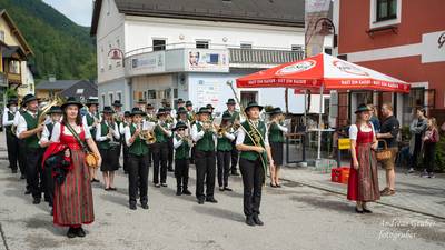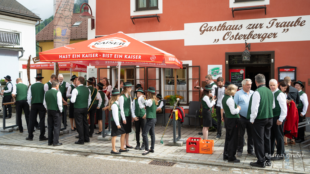 Mit flotter Marschmusik holten mit unserem traditionellen Weckruf das Dorf aus den Träumen. Rund neun Kilometer marschierten wir, angeführt von unserer Michaela am Vatertag durch die Siedlungen. Zahlreiche Einladungen zu kurzen Halts boten uns eine kleine Rast mit willkommenen Erfrischungen. Wir bedanken uns bei den Familien Hubert Mandl und Josef Schnabler für die erste Rast. Eine kurze Pause gönnte wir uns bei Maria Anna und Hermann Jagersberger. Nach einem stärkenden Frühstück im Musikheim freute sich Bgm. Manuela Zebenholzer mit ihrer Familie über den morgendlichen musikalischen Gruß bei ihr zu Hause. Beim Dorfplatzwirt Dominik Fellner Gasthaus Osterberger durfte die Kapelle natürlich nicht vorbeimarschieren und wir erledigten auch gleich unsere Stimmabgabe zur EU-Wahl. Ein großer Dank gilt den beiden Familien Franz und Helmut Paumann. Hier gab es neben den kühlen Erfrischungen auch eine kräftige Jause und Mehlspeisen. Den vorletzten Stopp machten wir bei Vizebgm. Walter Holzknecht und unserem ehemaligen Kapellmeister Christian Gruber. Nach sechs Stunden marschieren durch die Gemeinde schafften wir perfekt zur Mittagszeit unser Ziel. Mit der Einladung zum Mittagessen bei Franziska und Andreas Kronsteiner fand der Weckruf seinen gemütlichen Ausklang.