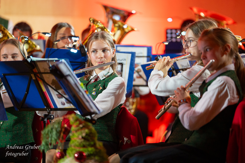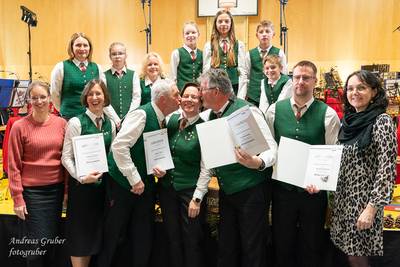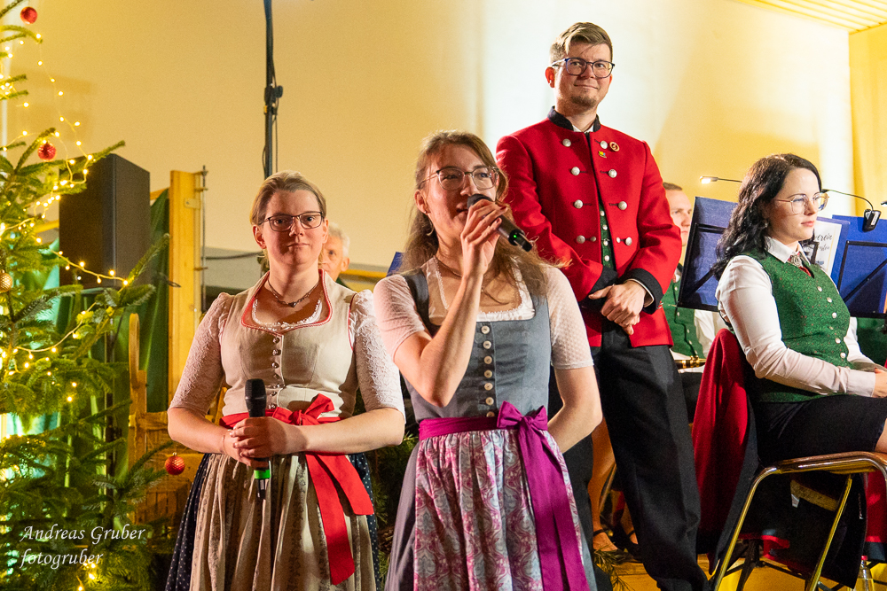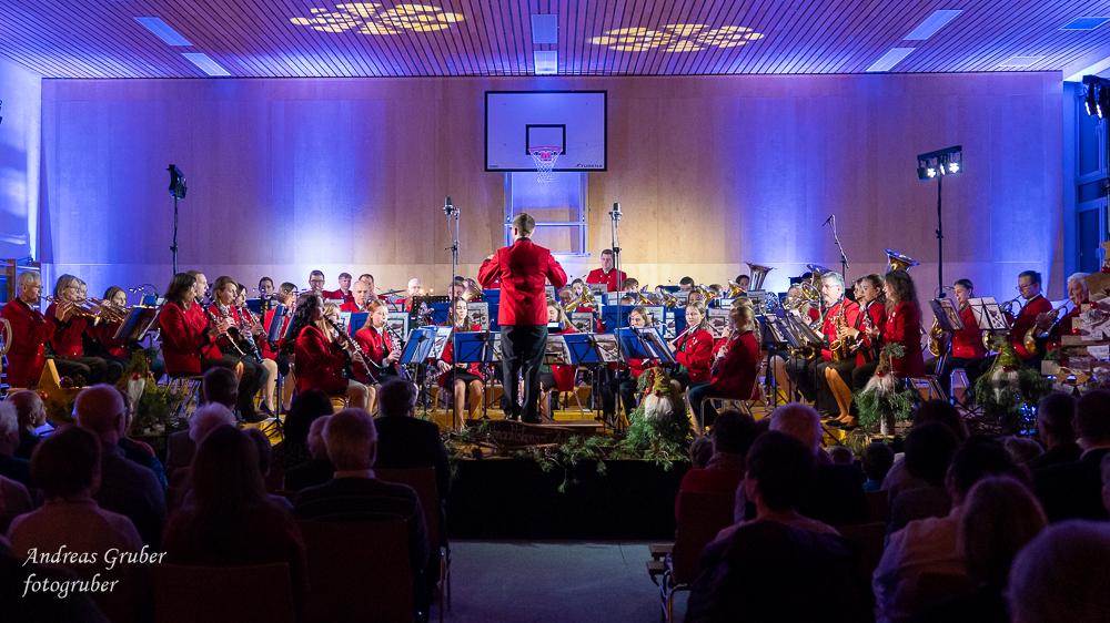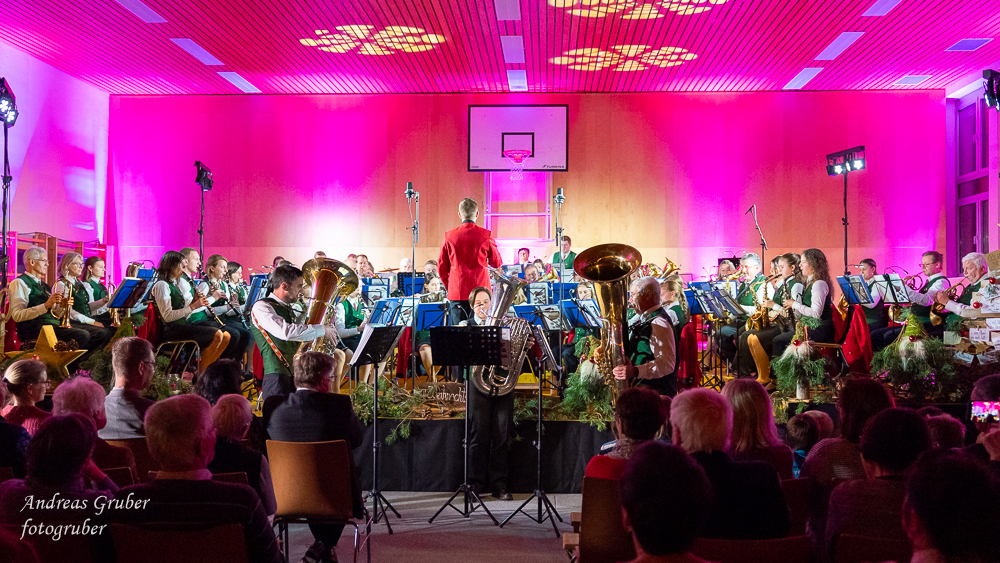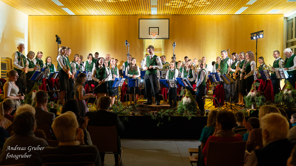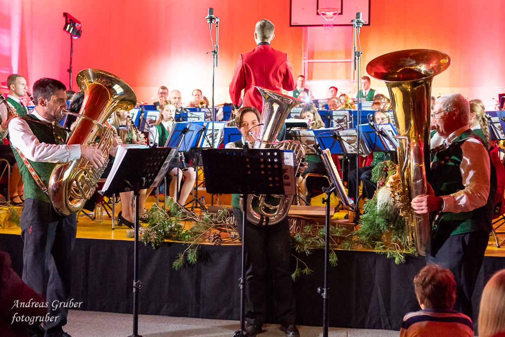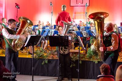 Zahlreiche Ehrengäste und Musikkollegen der Nachbarkapellen, sowie unzählige Freunde der Blasmusik erlebten im restlos gefüllten Turnsaal der Neuen Mittelschule einen wunderbaren und abwechslungsreichen Konzertabend. Unverwechselbar und überaus charmant führten Sandra und Katharina gespickt mit Humor und Wissenswerten durch das Programm. Im Rahmen des Abends ehrte unsere Obfrau Sabine langjährige aktive Mitglieder. Unser Kapellmeister David sorgte gemeinsam mit seiner Stellvertreterin Ina für ein dynamisches Programm. Wir eröffneten unseren Jahreshöhepunkt mit dem „Fliegermarsch“. Mit „Of Fairies and Elves“ folgte unser Pflichtstück aus der heurigen Konzertwertung. Mit "Big B", dem Solostück für drei Tuben setzte David einen Kracher ins Programm, von dem unser Publikum mit Begeisterung eine Zugabe forderte. Natürlich hatte unser Kapellmeister auch in diesem Jahr eine Eigenkomposition mit dabei, eine Polka namens "Voi wurscht", gemeinsam mit Georg Mandl komponiert. Ina dirigierte Musik aus dem allseits bekannten und beliebten Kinofilm "Home Alone - Kevin allein zuhause". "African Symphonie" setzte den Schlusspunkt der ersten Konzerthälfte. Klassisch starteten wir nach unserem Jugendorchester mit "Arioso" von Johann Sebastian Bach in die zweite Konzerthälfte. Als musikalischen Höhepunkt nach der Pause führten wir "Troja", unser Selbstwahlstück der Konzertwertung, auf. "Schena Mensch", ein Hit der Gruppe Folkshilfe, beendete unser Konzert. Nach kräftigem Applaus gabs natürlich eine Zugabe, „ABBA - When all is said and done“. Den traditionellen Schlusspunkt des Weihnachtskonzertes setzte ein kräftiges Prosit Neujahr gefolgt vom „Radetzky-Marsch“. An dieser Stelle ein riesengroßes Dankeschön an alle, die uns beim Weihnachtskonzert unterstützt haben.