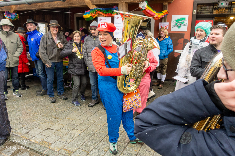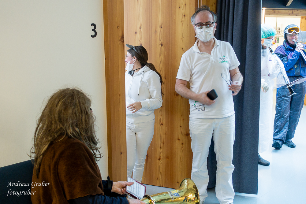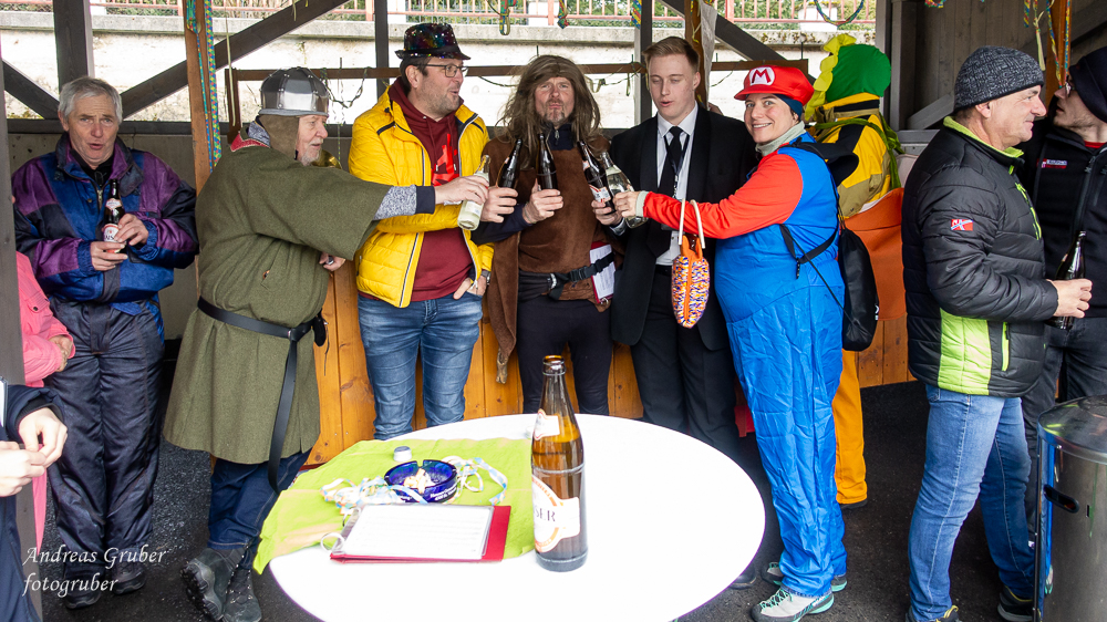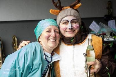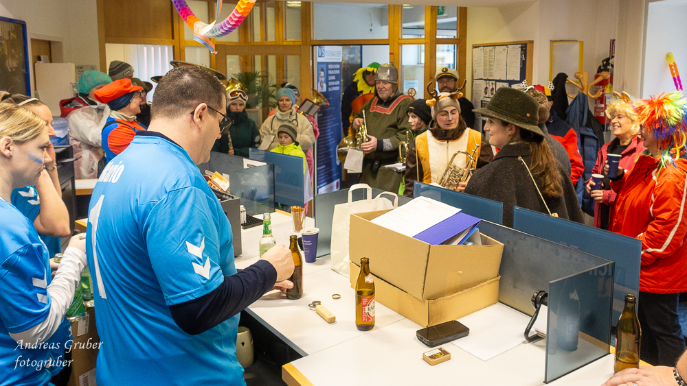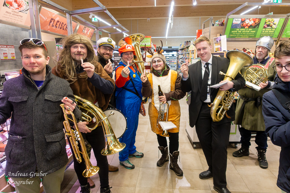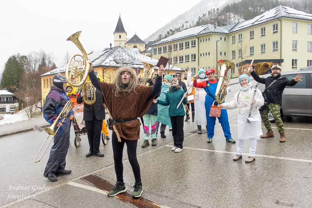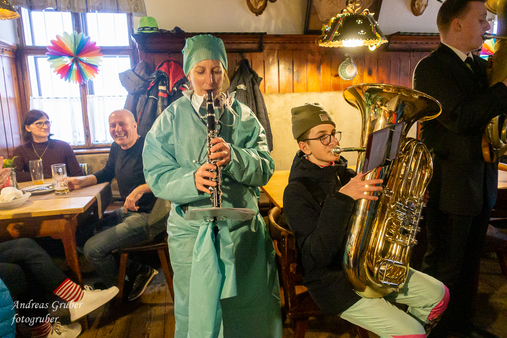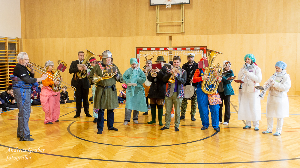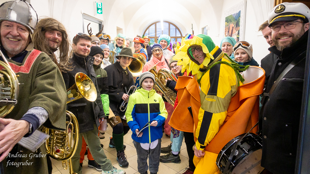 Topmotiviert zogen wir musikalischen Faschingsnarren durchs Dorf. Auf Grund der schlechten Witterung fiel der gemeinsame Einzug in den Dorfplatz mit den Kindern aus dem Kindergarten und der Schule ins Wasser. So galt unser erster Besuch unseren Jüngsten. Im Kindergarten empfing man uns mit fröhlichen Liedern und Darbietungen. Danach gabs einen kurzen Zwischenstopp in der Praxis unseres Zahnarztes, inklusiver Notfallbehandlung. Im Turnsaal der Mittelschule gings dann richtig zur Sache. Mit musikalischen Hits und coolen Tänzen steppte der Bär. Zurück im Dorf Stationen beim Gasthaus Osterberger, Versicherungsmakler Seisenbacher, Rathaus, Spar Gratzer und PlanBauHolz. Den fröhlichen Ausklang feierten wir im Gasthaus Osterberger.