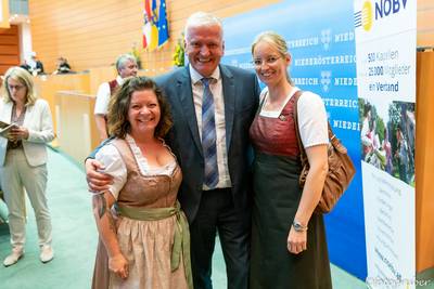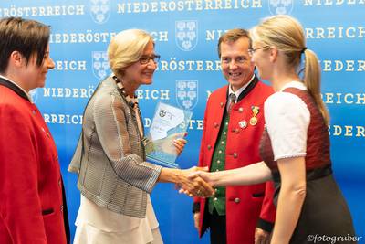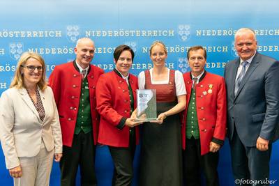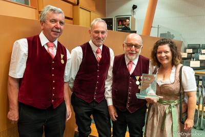Auf Einladung unserer Landeshauptfrau Johanna Mikl-Leitner gab es einen kleinen Ausflug ins Landhaus nach St. Pölten. Im Rahmen einer stimmungsvollen Feier bekamen wir den Ehrenpreis in Silber überreicht. Begleitet hat uns unsere Bgm. Manuela Zebenholzer. Im Landhaus trafen wir unsere Kollegen vom Musikverein St. Georgen am Reith mit Kapellmeister Siegfried Rabl, Obmann Franz Hager, Siegfried Aigner und Bgm. Birgit Krifter.