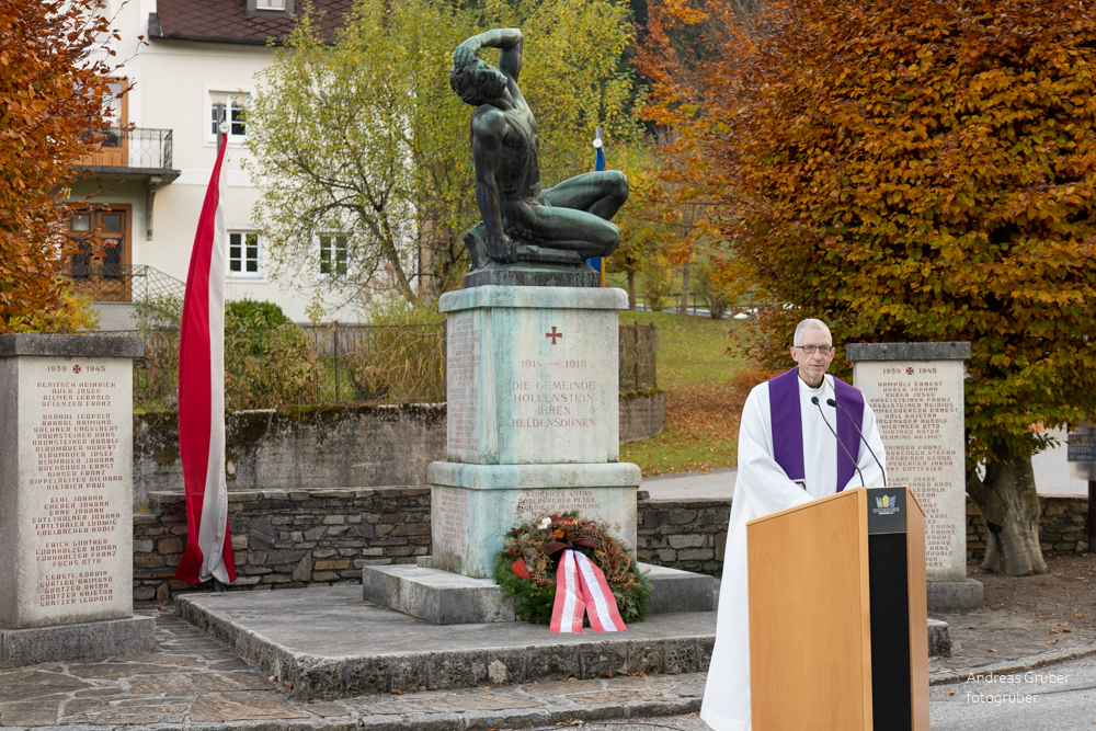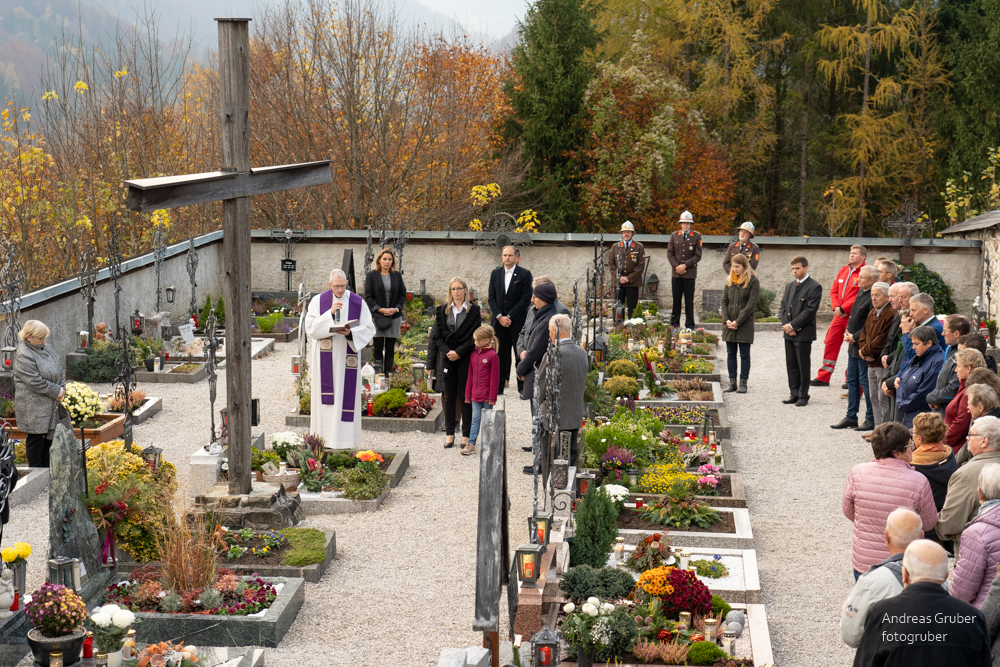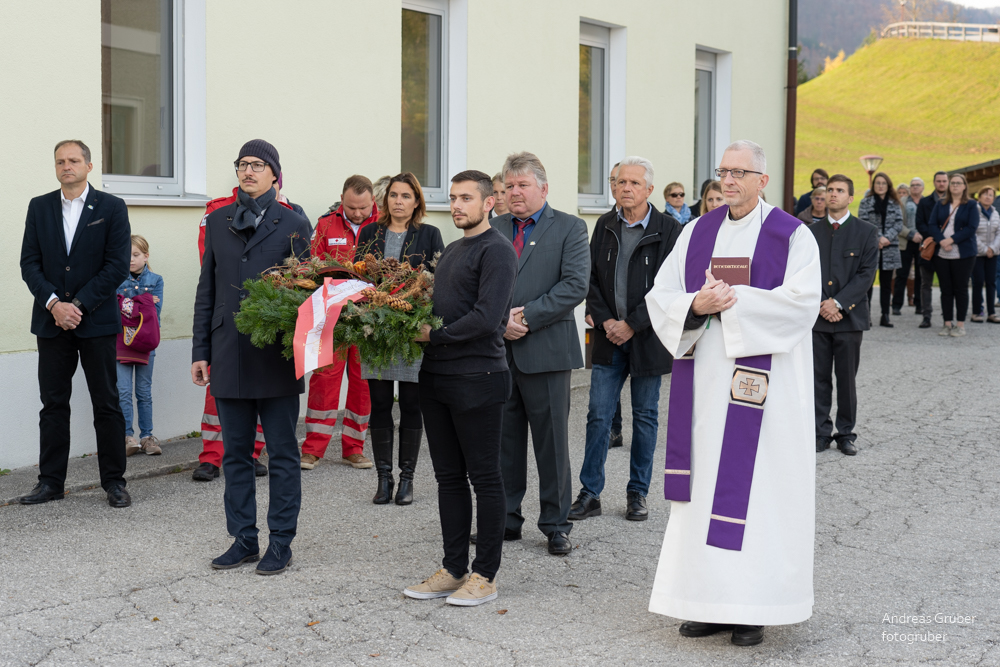 Die Gemeindeführung mit den Vertretern der Blaulichtorganisationen und der Vereine holten wir vom Rathaus ab und geleiteten sie zum eigentlichen Gedenkakt beim Kriegerdenkmal. anschließend zur Segnung der Gräber am Friedhof.