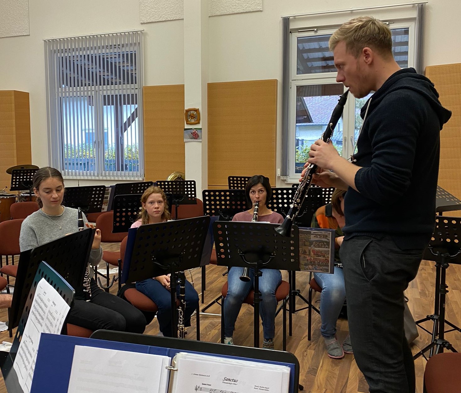 Einen genialen Nachmittag verbrachten wir mit dem begnadeten Klarinettisten Frederic Alvarado-Dupuy. Er spielt unter anderen bei der Gruppe "Federspiel" und der "Postwirtmusi" mit. Nebenbei ist er auch noch Intendant der Gipfelklänge, wo wir ihn bei unserem Dämmerschoppen auch kennenlernen durften. Mit seiner super sympathischen Art hat er uns in den wenigen Stunden viel beigebracht. Mit vielen Tipps zu Tonqualität, Spiel- und Atemtechnik kann unser Weihnachtskonzert kommen. Besten Dank Fredl für deine Zeit mit uns. Wir freuen uns auf eine Wiederholung.