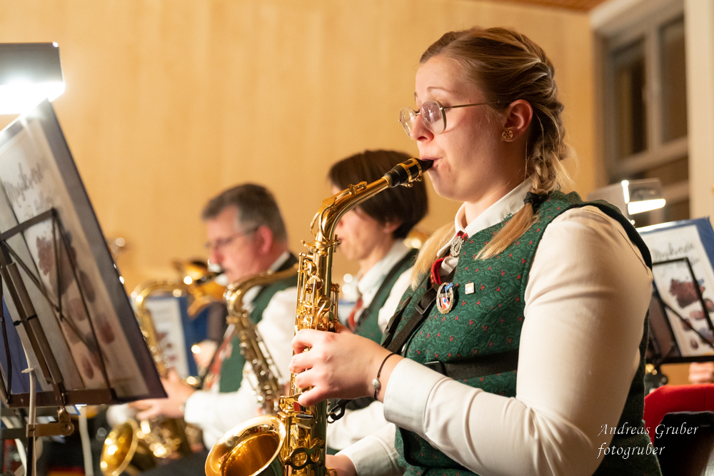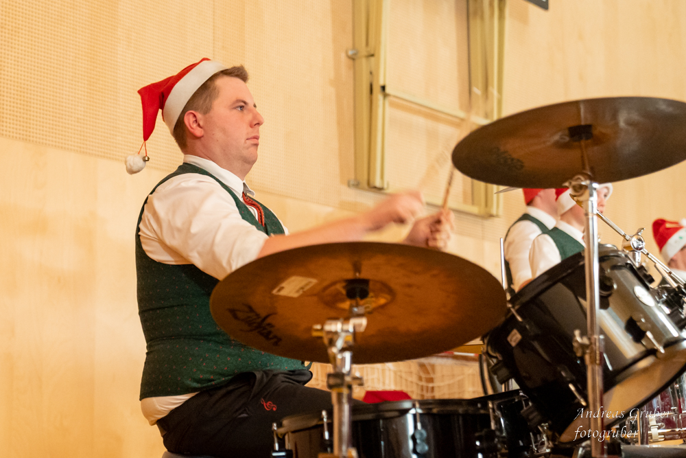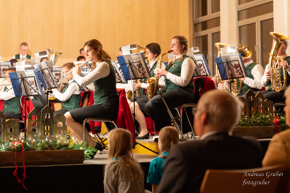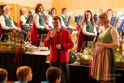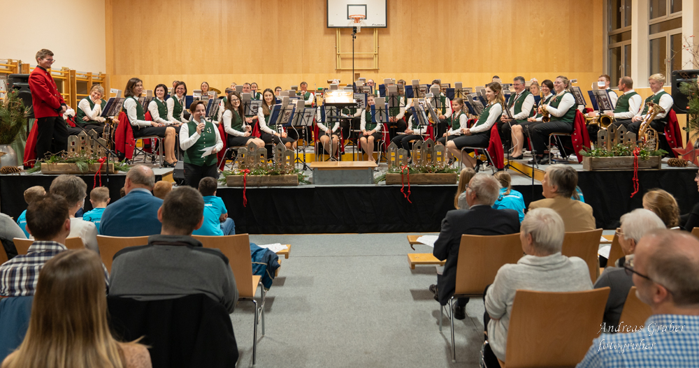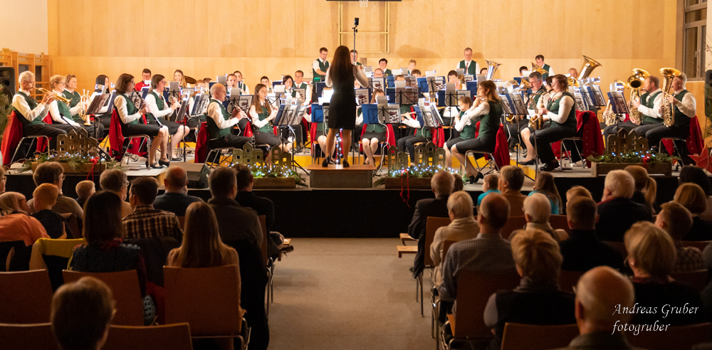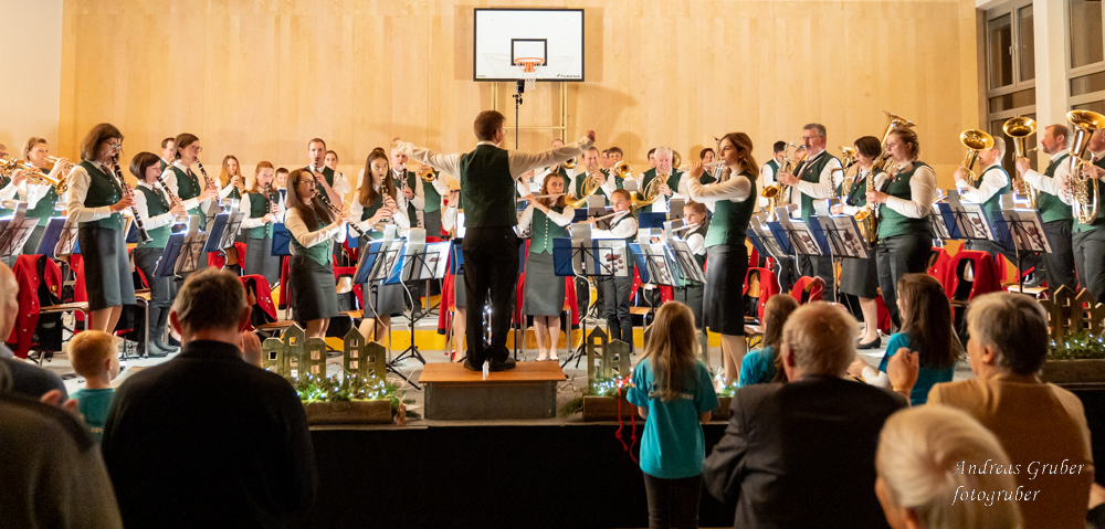 Mit "Carmina Burana" einem überaus imposanten Werk von Karl Orff starteten wir zu unserem traditionellem Termin ins Weihnachtskonzert. Geleitet von David und Ina boten wir herrliche Kompositionen aus vielen Bereichen der Musik. Unsere beiden Wertungsstücke "Monumentum" und "Enjoy the Music", mit denen wir bei der heurigen Konzertwertung einen großartigen Erfolg einspielten, gehörten natürlich dazu. Ina führte uns über den Atlantik zuerst nach Nordamerika mit "Der mit dem Wolf tanzt" in die unendlichen Weiten der Prärie. Mit "Gabriel´ s Oboe", von Ina für Klarinette arrangiert, ging unsere Reise solistisch nach Südamerika. Unser Posaunenquartett holte das Publikum aus der Pause zurück zum begeisternden Auftritt unseres Jugendorchesters. Der "Kaiserin Sissi Marsch" eröffnete den zweiten Teil unseres Konzertabends. Mit der überaus flotten "Fanynka Polka" besuchten wir unsere böhmisch-mährischen Nachbarn. Danach flanierten wir genüsslich mit "Les Champs Elysees" über die Pariser Prachtstraße. Mit dem aktuellen Hit "Merry Christmas" gesungen von unseren Flötistinnen Tina und Carina und arrangiert von Kapellmeister David beendeten wir unser Konzert. Als Zugabe hatten wir "Best of Mark Forster", ebenfalls von David für uns arrangiert, vorbereitet. Mit einem kräftigen "Prosit Neujahr" und dem "Radetzky Marsch" war es dann leider schon vorbei. Ein herzliches Dankeschön an alle, die uns fürs Gelingen unseres Konzertes unterstützt haben. Ein riesiges Danke an unser Publikum für euer Kommen und euren großartigen Applaus!