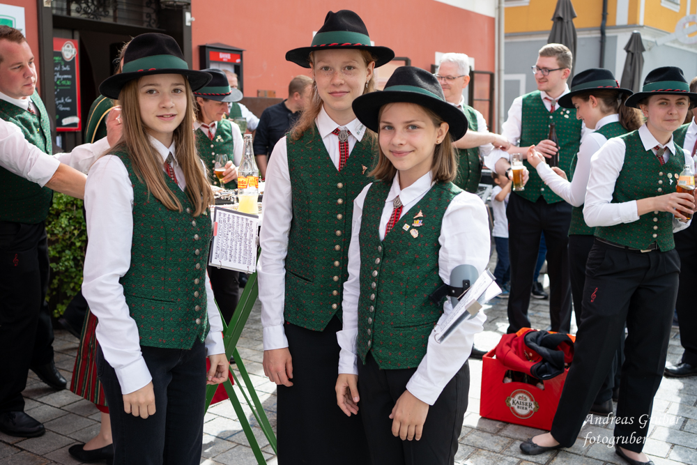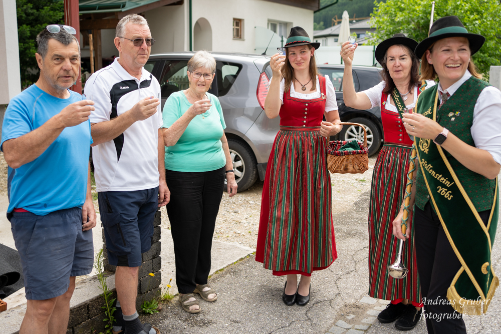 Mit flotter Marschmusik holten mit unserem traditionellen Weckruf das Dorf aus den Träumen. Rund neun Kilometer marschierten wir, angeführt von unserer Michaela am Vatertag durch die Siedlungen. Zahlreiche Einladungen zu kurzen Halts boten uns eine kleine Rast mit willkommenen Erfrischungen. Wir bedanken uns bei den Familien Hubert Mandl und Josef Schnabler für die erste Rast. Eine kurze Pause gönnte wir uns bei Maria Anna und Hermann Jagersberger. Nach einem stärkenden Frühstück im Musikheim freute sich Bgm. Manuela Zebenholzer mit ihrer Familie über den morgendlichen musikalischen Gruß bei ihr zu Hause. Beim Dorfplatzwirt Dominik Fellner Gasthaus Osterberger durfte die Kapelle natürlich nicht vorbeimarschieren und wir erledigten auch gleich unsere Stimmabgabe zur EU-Wahl. Ein großer Dank gilt den beiden Familien Franz und Helmut Paumann. Hier gab es neben den kühlen Erfrischungen auch eine kräftige Jause und Mehlspeisen. Den vorletzten Stopp machten wir bei Vizebgm. Walter Holzknecht und unserem ehemaligen Kapellmeister Christian Gruber. Nach sechs Stunden marschieren durch die Gemeinde schafften wir perfekt zur Mittagszeit unser Ziel. Mit der Einladung zum Mittagessen bei Franziska und Andreas Kronsteiner fand der Weckruf seinen gemütlichen Ausklang.