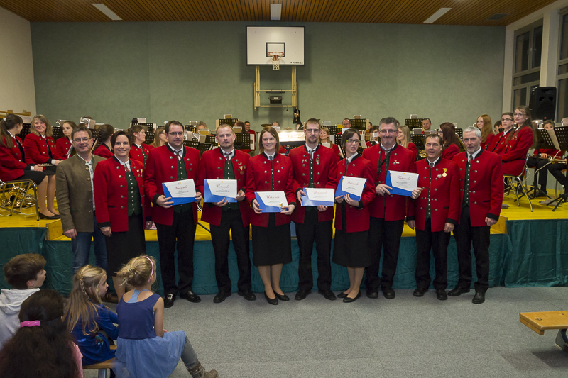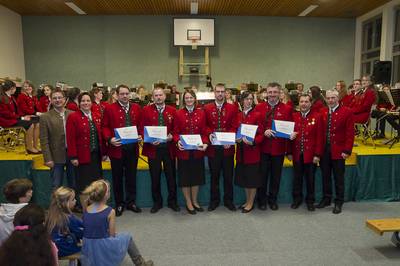 Im Rahmen des Weihnachtskonzertes ehrte unsere Obfrau gemeinsam mit Bezirksobmannstellvertreter Johann Meisinger verdiente Musiker. Jakob Bissenberger, Barbara Hörhahn und Marion Schnabler erhielten die bronzene Ehrenmedaille für fünfzehn Jahre aktives musizieren. Die silberne gab´s für Josef Aigner, Karin Jagersberger und Michaela Steineck für fünfundzwanzig Jahre. Für vierzig Jahre bekamen Eckehard Buder und Herbert Schenk die Goldene verliehen. Die Musik gratuliert herzlichst und freut sich auf viele weitere gemeinsame Jahre.