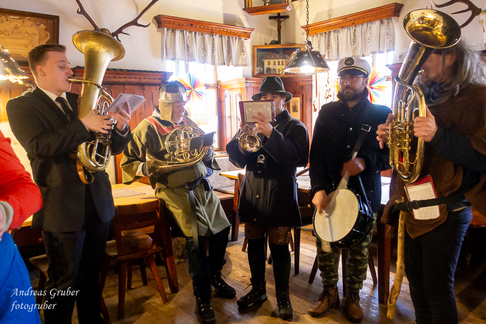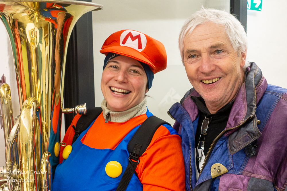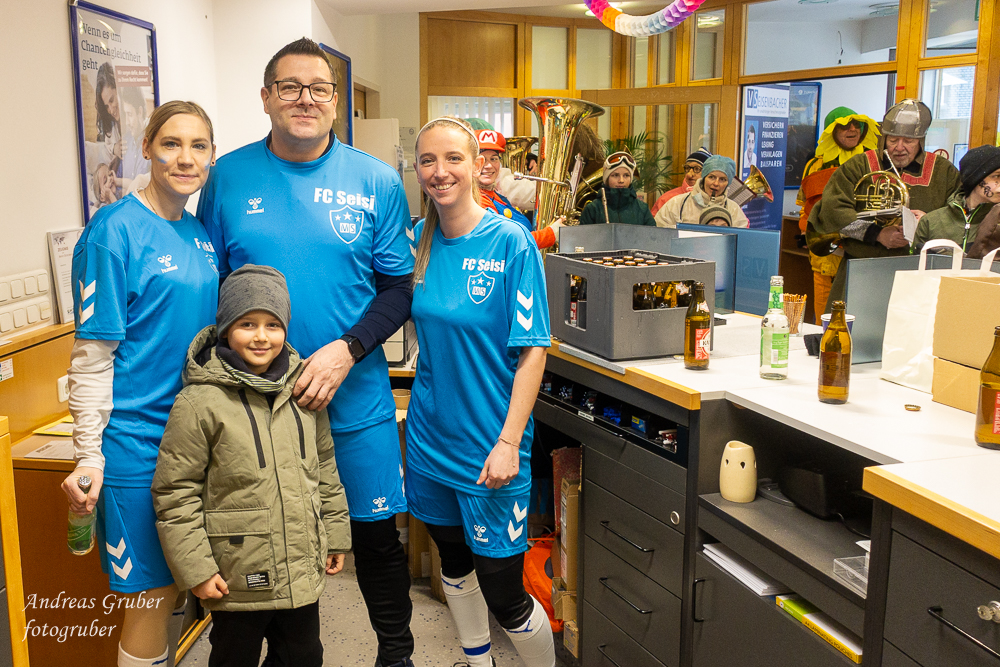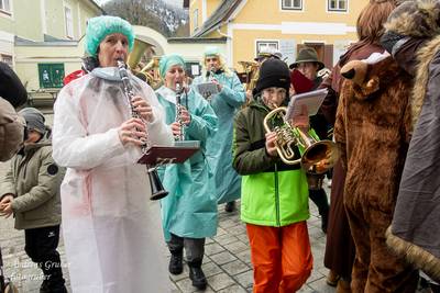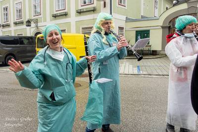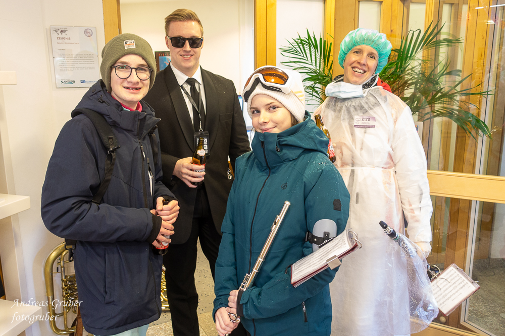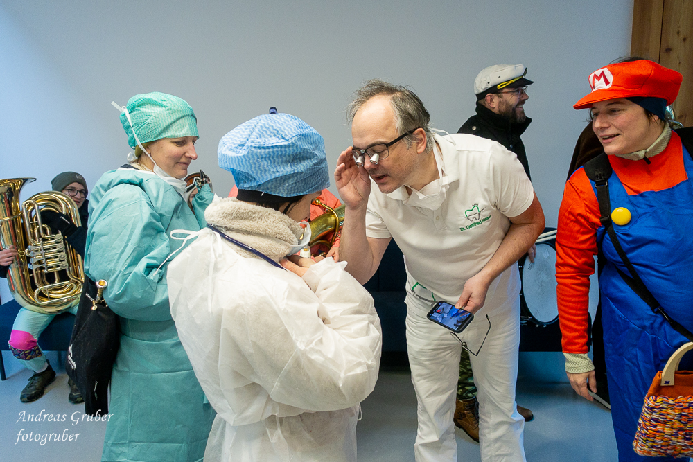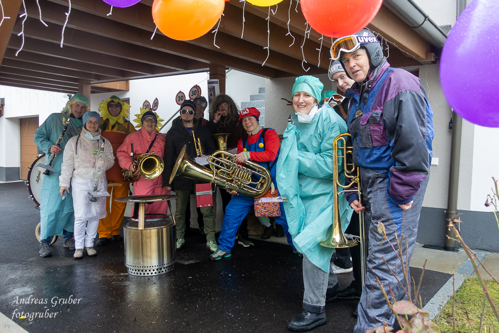 Topmotiviert zogen wir musikalischen Faschingsnarren durchs Dorf. Auf Grund der schlechten Witterung fiel der gemeinsame Einzug in den Dorfplatz mit den Kindern aus dem Kindergarten und der Schule ins Wasser. So galt unser erster Besuch unseren Jüngsten. Im Kindergarten empfing man uns mit fröhlichen Liedern und Darbietungen. Danach gabs einen kurzen Zwischenstopp in der Praxis unseres Zahnarztes, inklusiver Notfallbehandlung. Im Turnsaal der Mittelschule gings dann richtig zur Sache. Mit musikalischen Hits und coolen Tänzen steppte der Bär. Zurück im Dorf Stationen beim Gasthaus Osterberger, Versicherungsmakler Seisenbacher, Rathaus, Spar Gratzer und PlanBauHolz. Den fröhlichen Ausklang feierten wir im Gasthaus Osterberger.