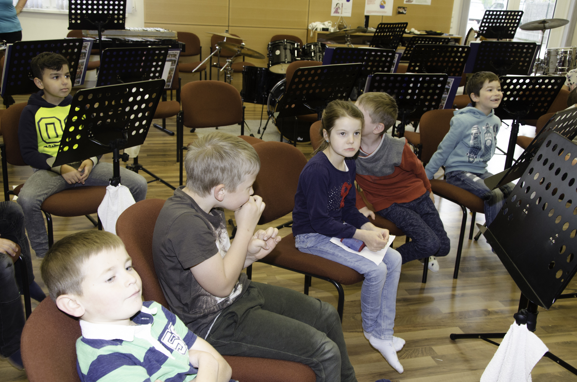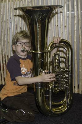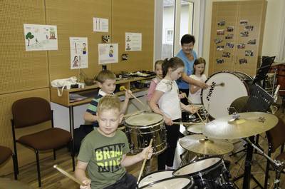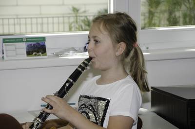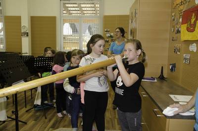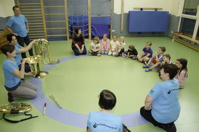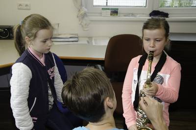 Volksschule und Kindergarten probieren Instrumente